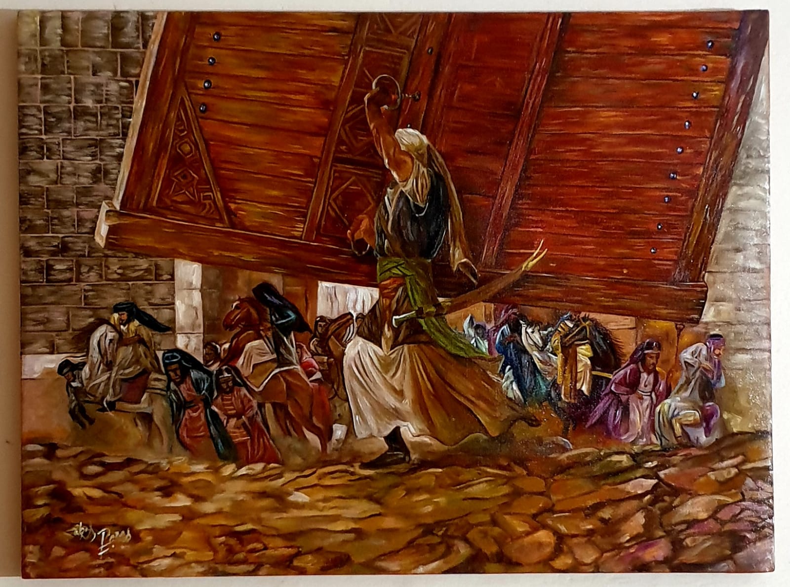 This evocative painting captures the legendary moment of Imam Ali ibn Abi Talib (A.S) lifting the massive gate of Khaybar during the historic Islamic battle. A symbol of divine strength, courage, and unwavering faith, Imam Ali stands at the center, surrounded by awe-struck companions, as the fortress of Khaybar falls. Rendered in rich, earthy tones with dramatic composition, this piece honors one of the most iconic victories in Islamic history and the unmatched valor of the Lion of God.