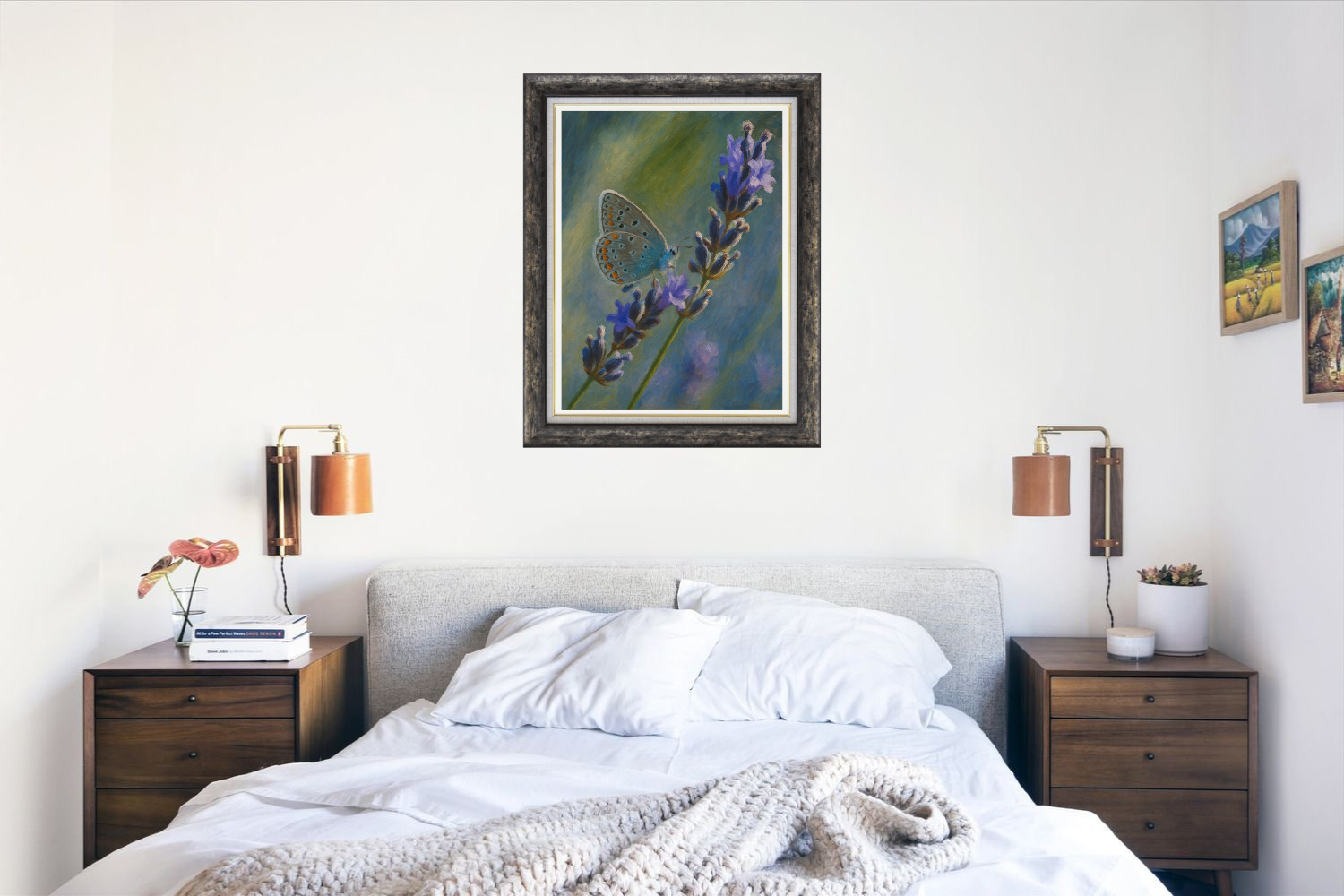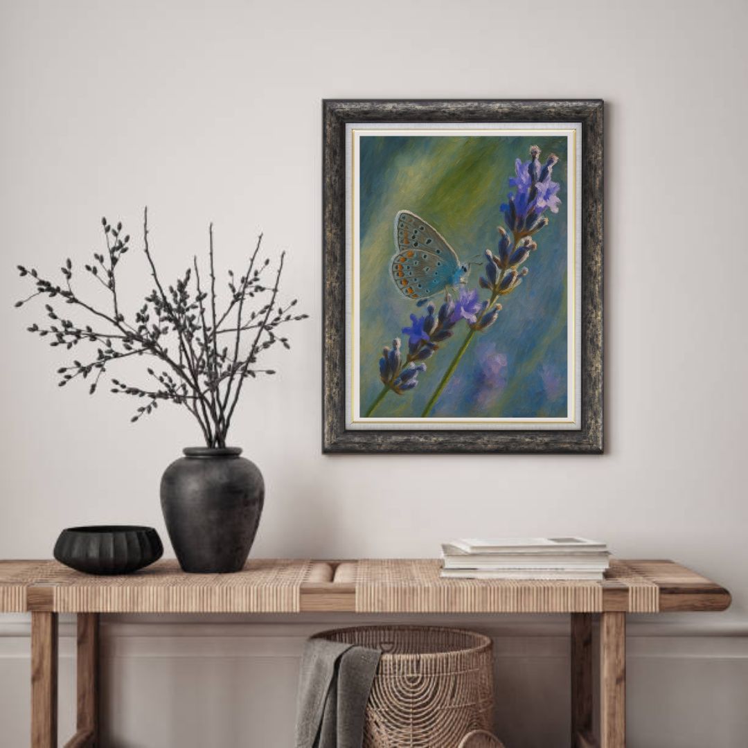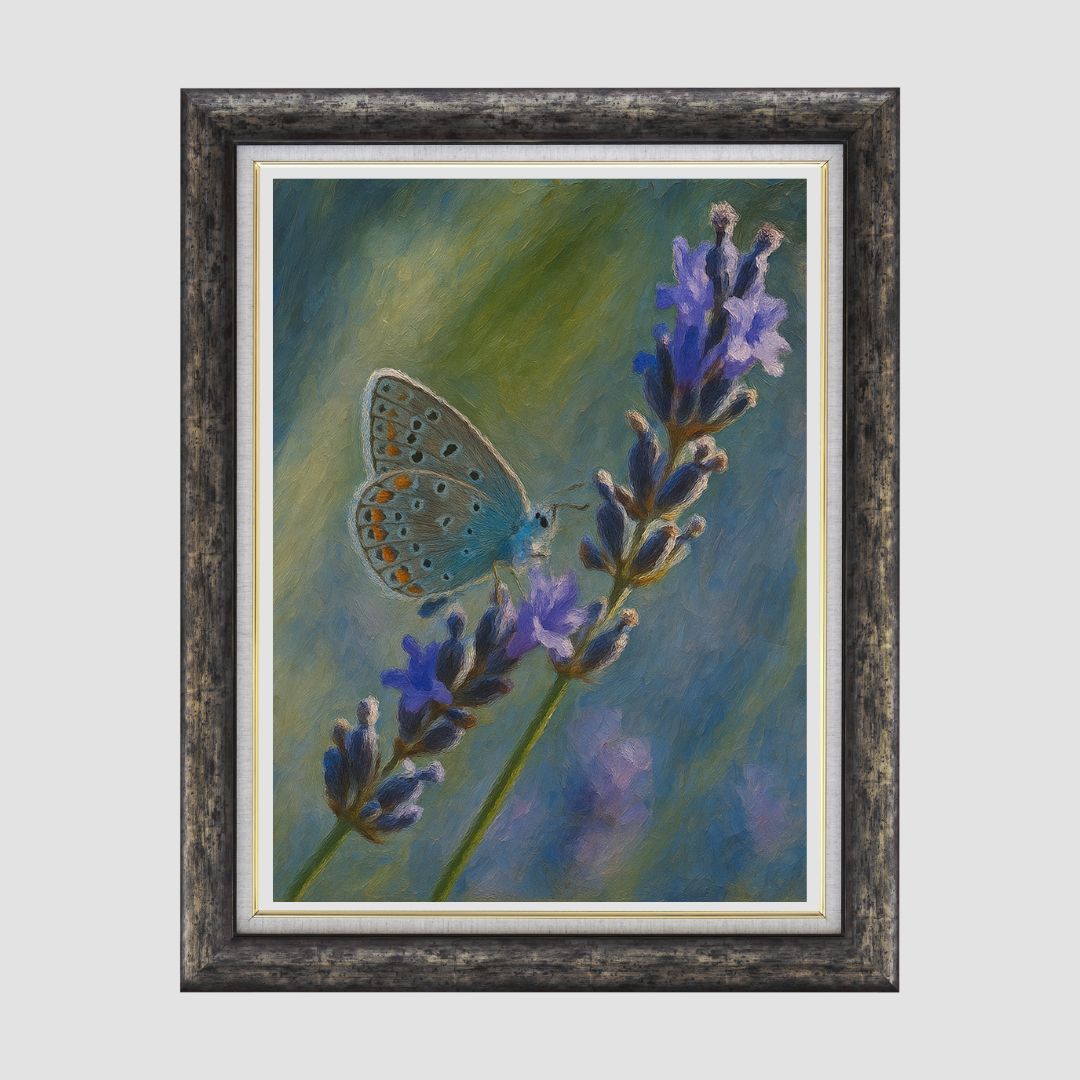 This captivating portrait captures a serene moment as a delicate blue butterfly rests on a sprig of blooming lavender. With soft brushstrokes and a soothing blend of greens, blues, and purples, the artwork evokes a peaceful connection between nature and stillness. Perfect for nature lovers and collectors of botanical or wildlife-themed art.